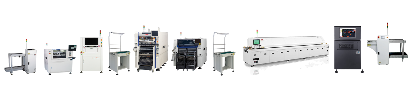 全自動上板機→ 全自動印刷機GKG  GSE→思泰克SPI →接駁臺 →YSM40R→ YSM20→ 接駁臺→ 勁拓回流焊→ 矩子在線AOI → 下板機(從左→ 右)